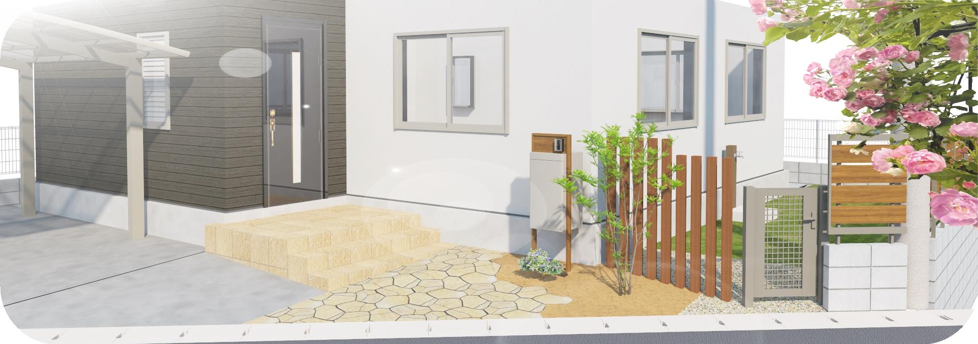 こちらの外構では、フェンスや、門柱のアクセントに木目調を取り入れたり、