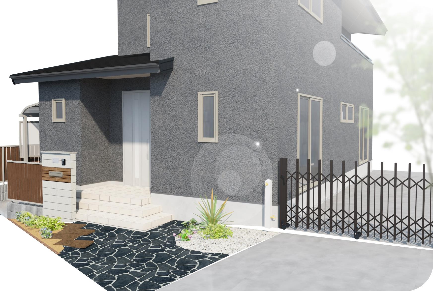 お家の外壁に合わせ黒の乱形石を用いたモダンな外構です。