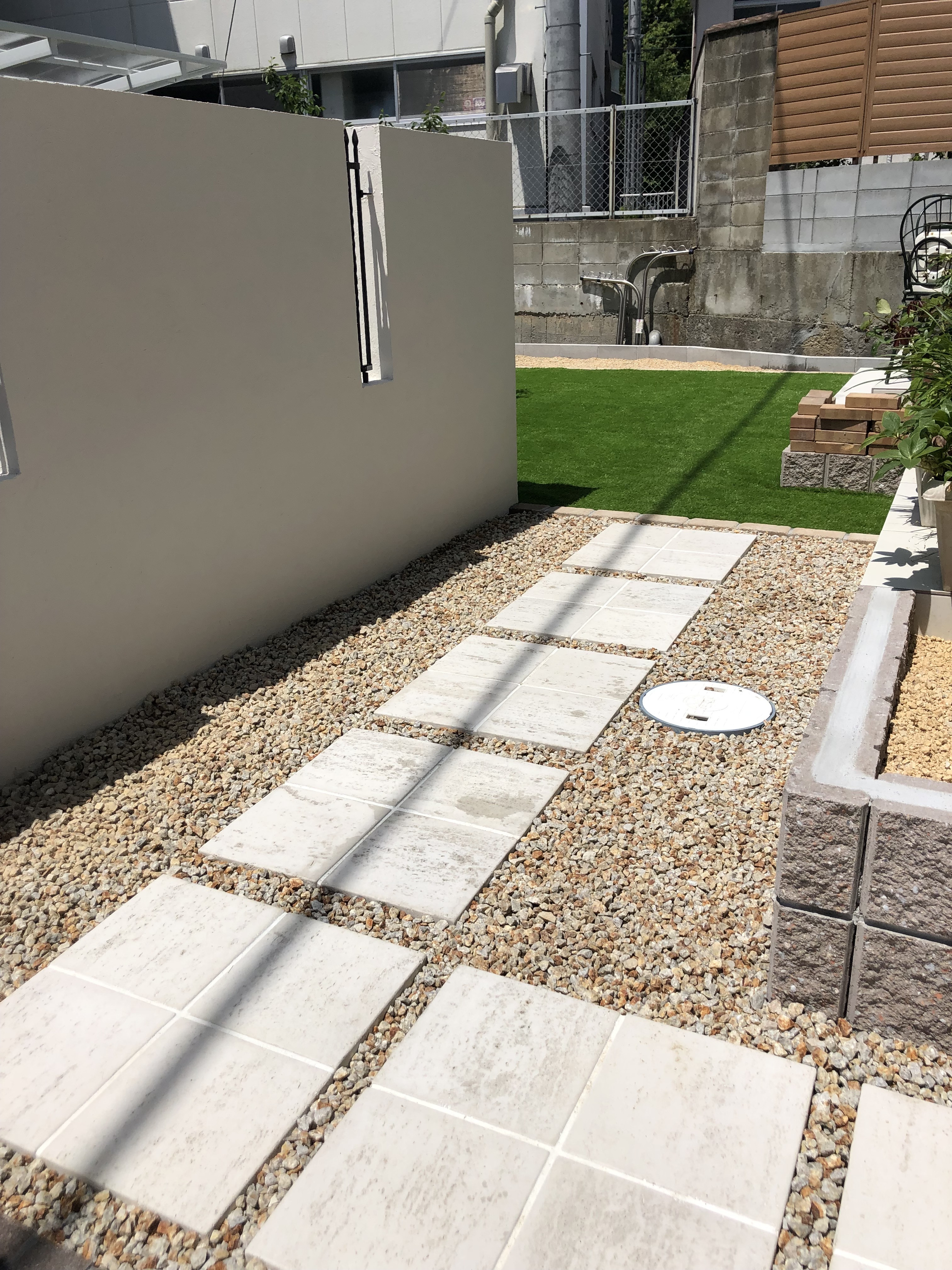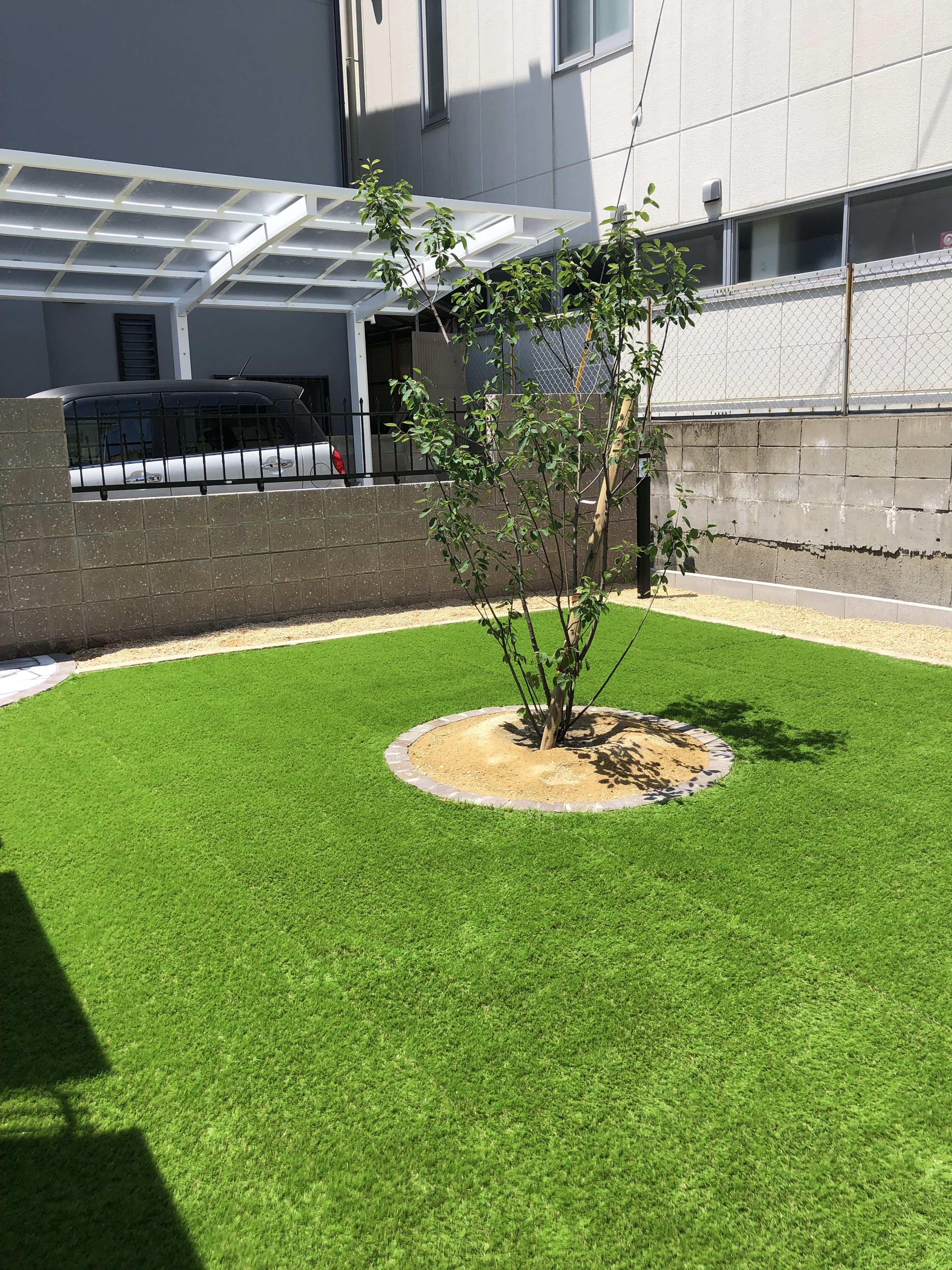 中には人工芝を敷、アクセントのシンボルツリー部分はクレモナピースで縁取りました!