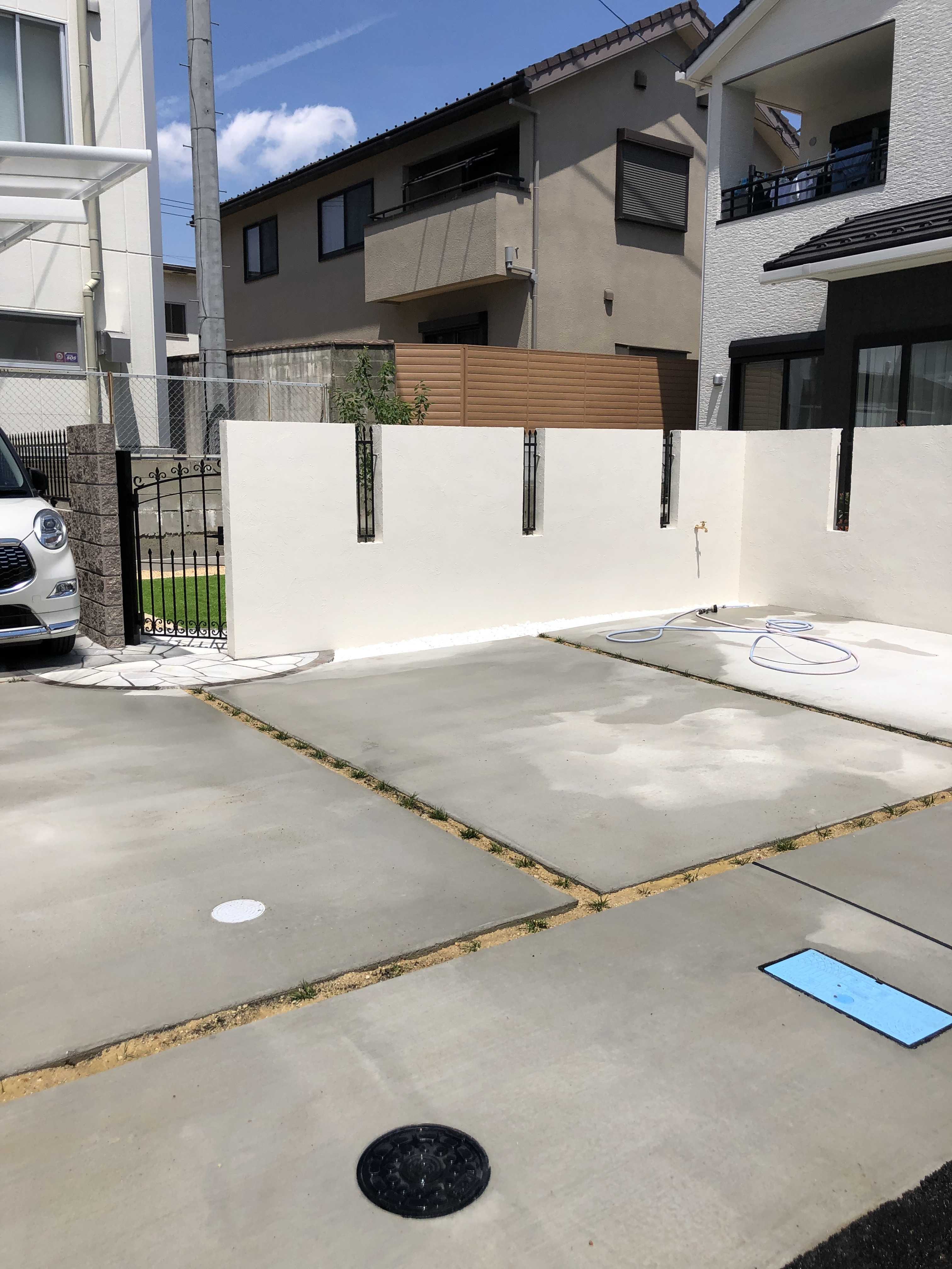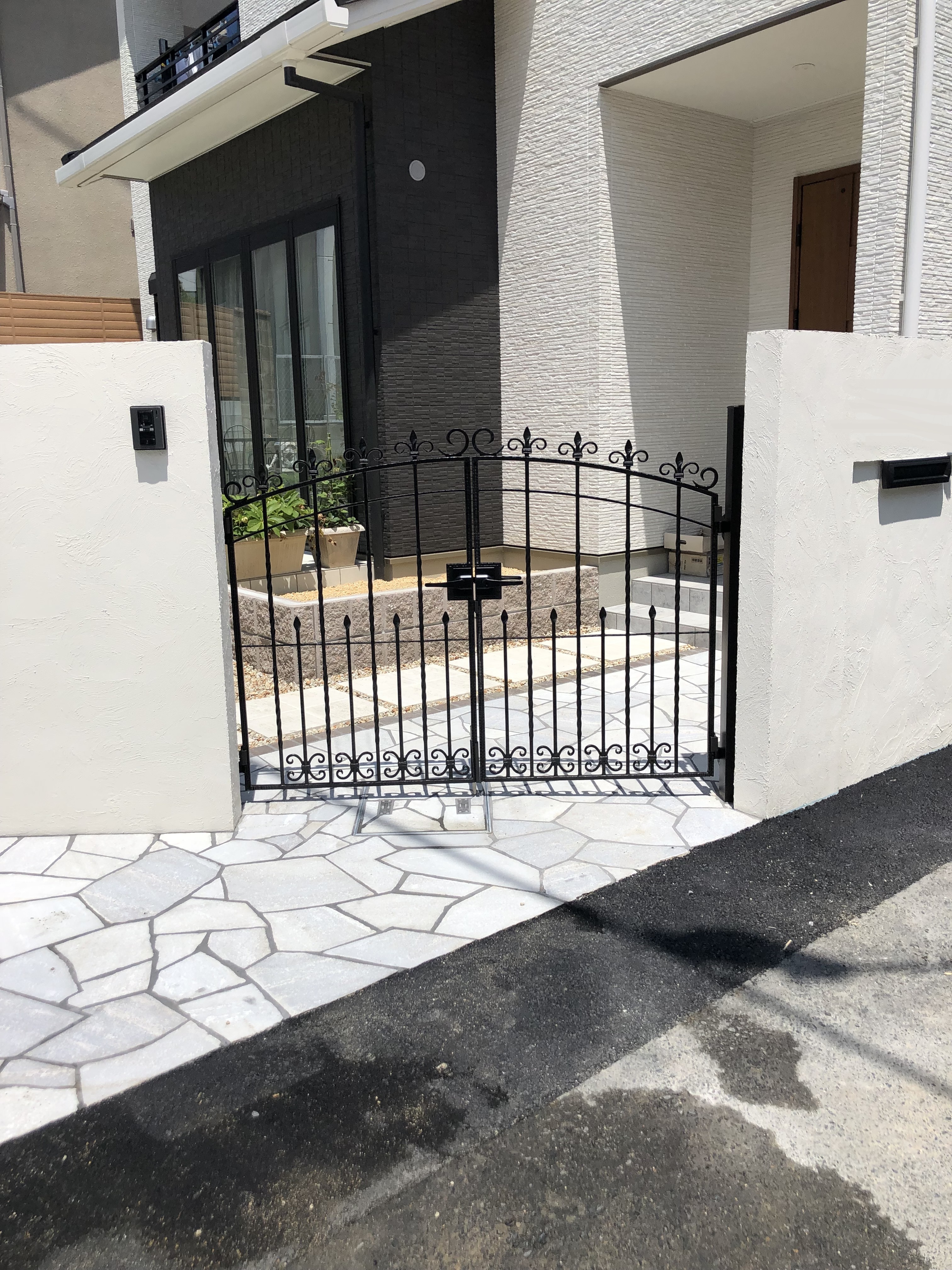 アンティークな門扉に白の塗り壁と乱形石で高級感のある仕上がりになりました♪
