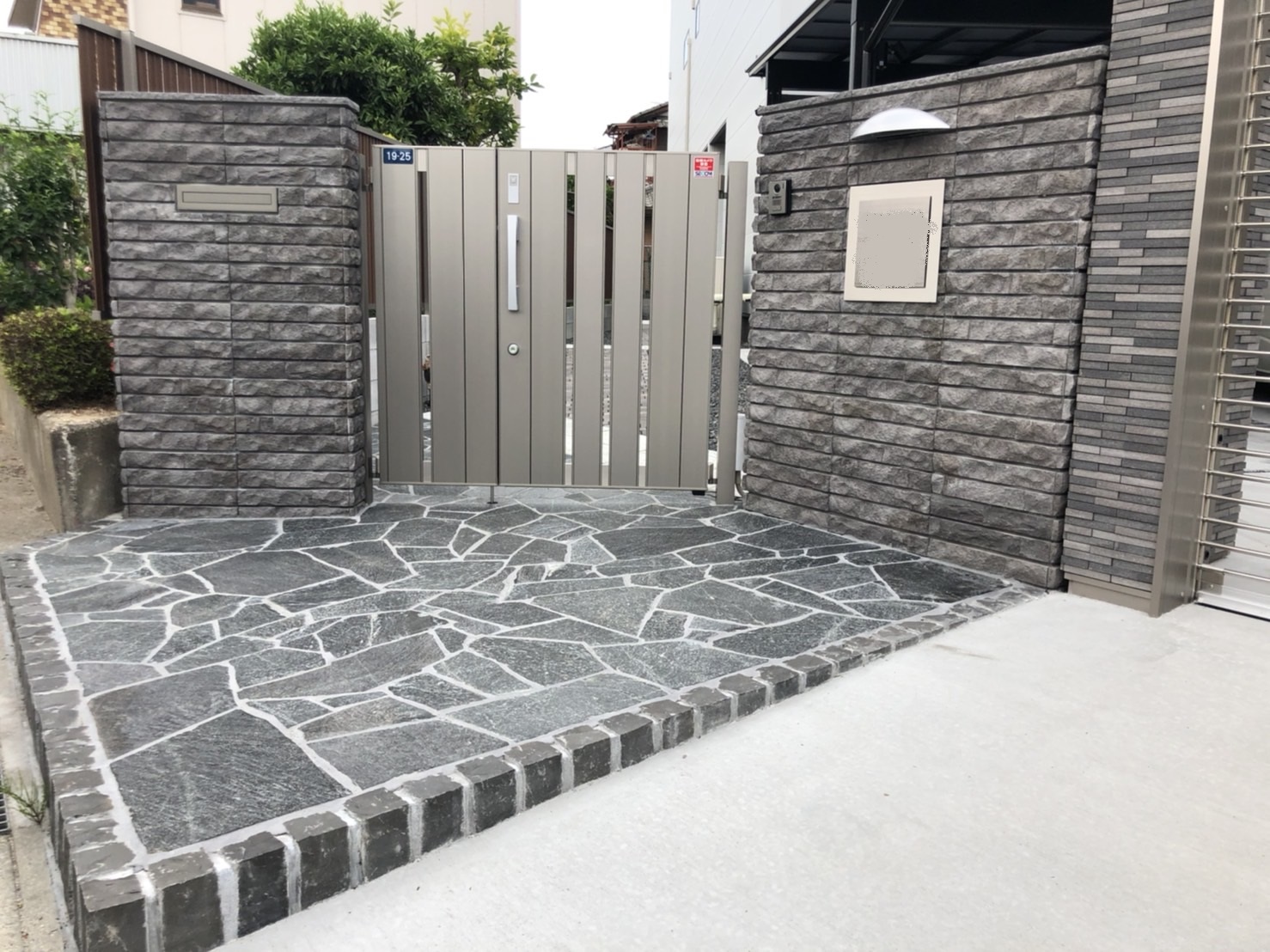 プレミオシリーズの化粧ブロック積みと黒の乱形石を使用することで、モダンな高級感漂う仕上がりとなっています。