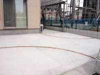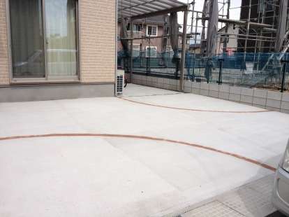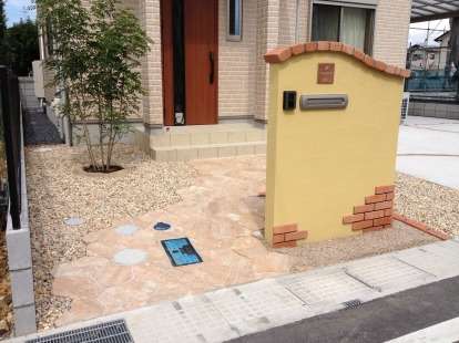 オープン外構アプローチに使用しているのはユニソンのティーナというコンクリート製の乱形石です。形は決まっているのでそれをパズルのように組み合わせていくのですが、アールにずらして張っているので規則的な感じにはならず、自然な感じに仕上がっています。門柱はレンガのアクセントで化粧しました。