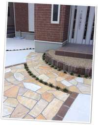 レンガ調の建物に合わせ、洋風なイメージでかわいくなりすぎないようにしました。門柱のアクセントタイルは天然石の大きさ違いで少し変化をつけています。アプローチには乱形石を使用しゴージャスに仕上がっています。