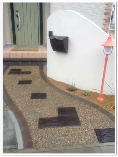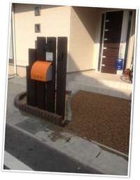 門柱2パターンです。どちらもかわいらしいイメージです。写真左は塗門柱で天端と横幅全体に曲線を描きアクセントにポールライトを取り入れました。玄関扉とケンカしないように色を選んでみました。写真右はコンクリート製の枕木を建てポスト・表札・ブラケット・インターホンを取り付けています。こちらはポストがアクセントになっています。