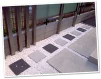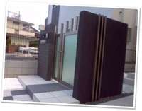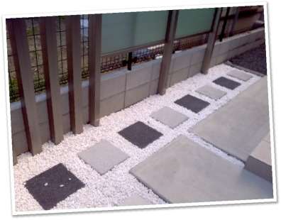 シンプルモダンです。黒と白を基調とし、スッキリシャープに直線的に仕上げました。全てを黒白交互にしてしまうと、すこしにぎやかになりすぎるため、タイルは黒のラインに敷きつめました。門扉はガラス色のポリカーボネートのものを使用し、目隠しフェンスも同じ素材の物で統一感が出ています。ビー玉をお施主様に買ってきていただいて、土間打設時に埋め込みました。外れる可能性もありますが、かわいらしいですね。遊び心も必要ですね。