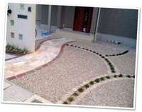 お客様用の駐車スペースは、空車の時が殺風景になるので、洗い出しとピンコロ、タマリュウで化粧をしました。これで、車が止まっていなくても、きれいなお庭になります。門柱はかわいらしく曲線で、ガラスブロックも1つだけピンク色を入れました。全体的にベージュ~ピンクでやさしい色遣いに仕上げています。