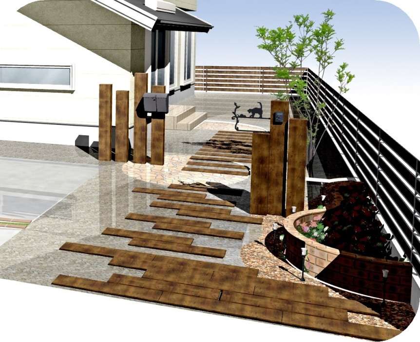 木をふんだんに使ったプランです。枕木は、好き嫌いがありますが、自然な感じをだすにはもってこいの素材です。しかしながら、天然素材だけにメンテナンスも必要ですし、どうしても腐食が気になるところです。後々のことを充分に検討されてからのご使用をお勧めいたします。最近ではコンクリート製の枕木も出てきました。少々お値段は高めですが・・・