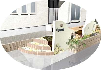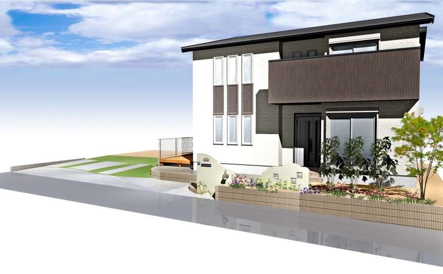 オープンなイメージではあるけれども掃出しの窓と玄関は少し目隠しが欲しいとのご要望でした。植栽と小さな壁を作ることで視線をそちらへ向けることができます。