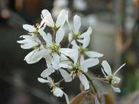 もともと北アメリカ原産の果樹です。日向~半日陰のやや湿った土壌を好みます。4月新芽の展開に先立って白い花を房状につけます。6月に熟す果実は食用となります。